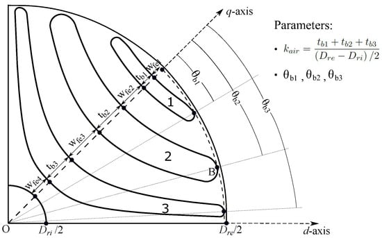 As one of the key issues for geometry optimization, SynRM rotor parametrization usually presents many degrees of freedom. The automatic drawing procedure proposed in [15], however, requires only two main parameters for SynRM rotor modeling, i.e., insulation ratio and barrier end angle . The streamlined flux barrier shape is adopted, which is set to be parallel to the d-axis flux lines and perpendicular to the q-axis flux lines when saturation is neglected. This allows one to theoretically maximize the d-axis inductance and minimize the q-axis inductance, thus achieving a high saliency ratio and high torque. Points on the q-axis, as shown in Figure 3, are selected as starting points of the flux barrier boundaries, and their coordinates are computed through the width of each flux barrier and the width of each iron path . By introducing the insulation ratio and the barrier end angles, is calculated according to the d-axis flux density distribution, and is obtained based on the q-axis magnetic voltage drop across the corresponding flux barrier. Related equations and some tuning tricks to overcome geometric issues can be referred to [15]. As a result, a robust and fast modeling framework for SynRM rotor design is created.