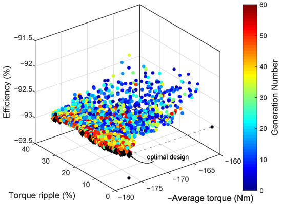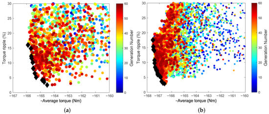 According to the previous investigation [15], three and four flux barriers per pole are studies in order to balance the output torque and manufacture difficulties. The optimization result for SynRM with three barriers per pole is plotted in Figure 4a, and the corresponding result of the four barriers per pole motor is shown in Figure 4b. Individuals are marked with dots on the average torque and torque ripple plane, where different colors indicate different generation numbers. For each individual, the current angle is tuned to achieve the maximum torque within the current limit. It is notable that the sign of the average torque is reversed because the aim of this optimization is to minimize each objective. The better solutions move towards the bottom left of the plane. The black diamonds form the Pareto front, which views clearly how each objective is penalized by the improvement in the other ones. The preferred compromise solution can be selected among the ones on the front.