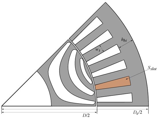 In this analysis, the rotor parameters (flux barrier number, barrier end angles and ) remain the same. The stator slot is simplified to a trapezoidal shape, as shown in Figure 5. The slot opening is calculated from the slot pitch and stator tooth width, while the slot wedge is neglected.