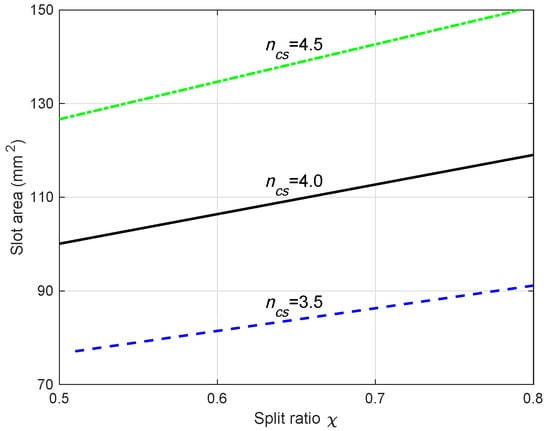From (9), all the parameters are constant, except , and . Therefore, the variation in the slot area with can be directly obtained once is given. The relationship of , and for a 48-slot 8-pole SynRM is plotted in Figure 6. The results show that the slot cross-area increases with the increase in the split ratio or .