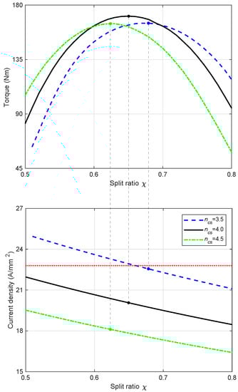 The variation of torque with a split ratio is shown in the upper plot of Figure 7, while the corresponding current density is plotted below. Obviously, there exists an optimal split ratio to achieve the highest torque, which is simultaneously affected by . On the other hand, the split ratio is constrained by the current density limit (shown by the dotted line in the lower plot of Figure 7), which is fixed to A/mm. This value is reduced from 25 A/mm of the Lexus LS 600h IPM motor due to the increased slot area in the simplified trapezoidal slot. With the decrease in , the current density tends to overcome the limit. Consequently, the calculation of the current density is required during the split ratio optimization process, and the candidates with current densities beyond the limit should be discarded. The maximum torque obtained from Figure 7 is Nm, with and .