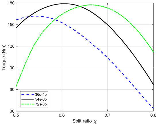 For each slot–pole combination, the split ratio optimization is carried out with the aforementioned procedure. After plenty of calculations and FEA simulations, the maximum torque for each slot–pole combination is again reported in Table 2. The optimal and are also shown. It is interesting to notice that the optimal split ratio is almost constant corresponding to the same number of pole–pairs. It is increased as the pole–pair number is increased, so as to reduce the tooth length and limit the slot leakage component. A similar conclusion was drawn for the PMaSynRM in [24]. The optimal is found to be inversely proportional to the slot number due to the constant copper loss constraint. In addition, the highest torque is achieved when the pole–pair number is three instead of two, which does not match with the previous finding that the higher pole number the lower torque [37]. In fact, the machine saliency ratio is dramatically reduced as the magnetic saturation increases under overload condition. Therefore, the merit of a thinner stator back iron for higher pole number is becoming more significant.