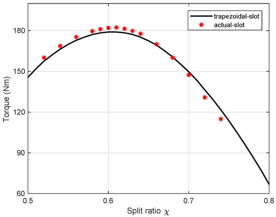 Torque versus split ratio comparison between the SynRMs with simplified “trapezoidal-shape” slot and “actual-shape” slot.
