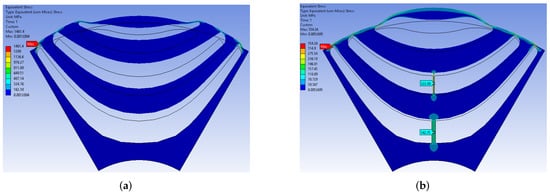 Mechanical stress distribution of the designed SynRM rotors at the speed of 10,230 rpmL: (a) The optimized SynRM rotor; (b) The optimized SynRM rotor with central bridges.