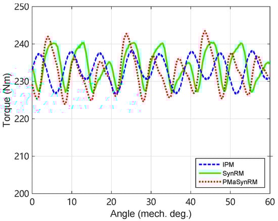 Torque waveform comparison of the three motors under the maximum current (the benchmark IPM motor: dashed lines; the SynRM: solid lines; the PMaSynRM: dotted lines).