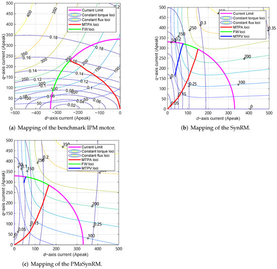 As far as the high-speed flux-weakening (FW) capability is considered, some control methodologies are adopted to achieve the best performance. The optimal current vector trajectory over base speed is achieved by means of FW control and maximum torque-per-voltage (MTPV) control [35]. When the inverter voltage limit is reached, the d-axis current is reduced to weaken the stator flux, i.e., the flux-weakening region. In some cases, for example, when the PM flux linkage is quite low, the current limit circle, the voltage limit ellipse and the MTPV trajectory intersect at a certain speed. Then, the motor moves to the MTPV region at higher speed, in order to maximize the torque under current and voltage limit. In this region, the current amplitude decreases with the increasing speed until reaching the maximum speed. The obtained current vector trajectory is plotted in Figure 13. Within the speed limit of 10,230 rpm, the IPM motor follows only FW operation, while the operations of the SynRM and PMaSynRM cover both FW and MTPV.