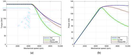 Comparison of torque and power variations versus speed of the three motors (the benchmark IPM motor: dashed lines; the SynRM: solid lines; the PMaSynRM: dotted lines): (a) Torque versus speed; (b) Power versus speed.