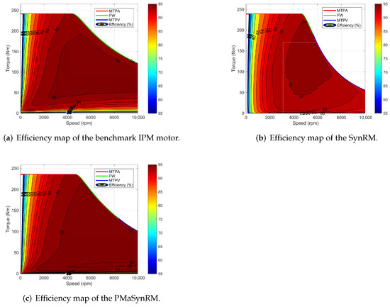 The maximum achievable efficiency of the PMaSynRM is higher than that of the benchmark IPM motor, which is as high as . In addition, a large portion of the operation region achieves an efficiency above in the PMaSynRM. It is also worth noticing that the efficiencies of both SynRM and PMaSynRM are higher than that of the IPM counterpart at high-speed low-torque conditions, which is mainly due to the lower flux density of the SynRM and PMaSynRM at this condition.