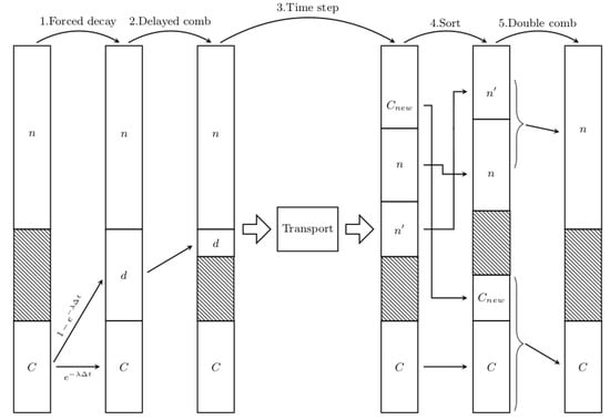 Throughout this paper, the sample number N will be given in a sense that N is the maximum of the number of samples used by the full workflow, or in other words, the allocated total storage size on the GPU taken up for the samples. As detailed in Figure 1, half of N is used for the prompt neutron samples (n), a quarter for precursors (C) and a quarter is left for buffer. At step 1. every precursor sample is split into two: a forced decay part (d) for the current time interval and a forced survival to the subsequent intervals, with weights proportional to the probability of occurrence. The decayed d number of precursors are then undergo combing to the average weight of n to even out the workload per sample. The transport of particles follows resulting in new precursors (), prompt neutrons surviving the time step without fission (n), and new prompt neutrons originating from fission events (). Next, another combing step merges n and together, and similarly C and together to arrive back to step one.