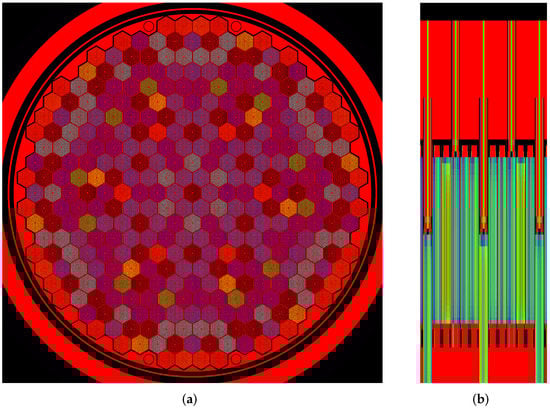 (a) VVER core model (with burnup) transaxial slice and (b) axial slice, different colours indicate different material composition.