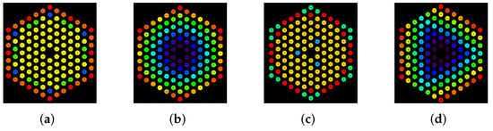 (a) Fresh fuel assembly of type Gd47 containing burnable Gd poison (blue pins) and (b) the same assembly after the burnup calculation. (c) Fresh fuel assembly of type Gd2n containing burnable Gd poison (blue pins) and (d) the same assembly after the burnup calculation. Different colours indicate different material compositions.