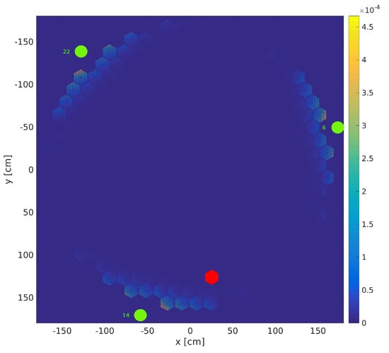 Different type of ionisation chambers are placed around the core in 24 ex-core positions, vertically at the maximum of nominal neutron flux distribution, somewhat lower than the middle elevation. Measured data was available from CFUL08 type fission chambers numbered 6, 14 and 22, their horizontal positions are indicated in Figure 6. Detector signals were simulated using weight functions pre-calculated independently by Monte Carlo [] and was provided as an input for our research. Weight functions were calculated for 21 axial nodes, sensitivity values are plotted in Figure 6 merged for the three detectors. Weight functions are interpreted as the detector reading per node and per single fission event sampled with Watt-spectrum. Only the pins closest to the detectors give sizeable contributions to the detector readings, and further, those are located at the edge of the core, with rapidly decreasing values with distance from the ionization chambers. Highest values are about , with an order of magnitude lower values on the other side of the respective assembly. Thus very low statistical variances are needed at the core edges if we wish to achieve reasonable detector reading estimates. Weight function changes are neglected due to geometry changes, and further the time required for the progenies of a fission event to reach a detector is considered to be instant.