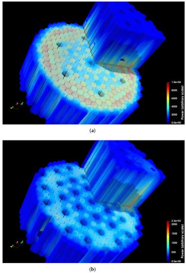 Power release data per node is saved throughout the whole calculation. Examples for the power release distributions at 5 s and 9 s are shown in Figure 8. (a) shows hollow areas only where the control assemblies are already inserted halfway into the core, (b) shows power release gaps also along the safety rod positions too, being all of the rods inserted at the end of the transient.