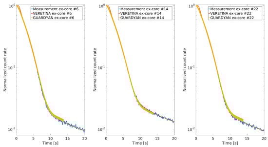 Comparison of ex-core detector signals to GUARDYAN and VERETINA results, logarithmic scale.