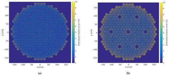 Concentrated in spherical regions, excess variance originated from a precursor sample in their centre with large weight, replicated by the combing process into identical samples tens of thousands in number. Figure 16a was generated setting precursor group probabilities of Equation (1) uniformly for emphasising the spatial effect of this phenomenon, causing the weight factor of Equation (2) to fluctuate. To obtain the smooth variance distribution shown in Figure 16b, apart from sampling proportionally to further variance reduction was necessary. The precursor generation step was modified to apply combing with a weighting factor of and further by applying a Russian Roulette with survival probability , requiring to continue the precursor generation longer until the bank is full. The resulting precursor weights will be then: