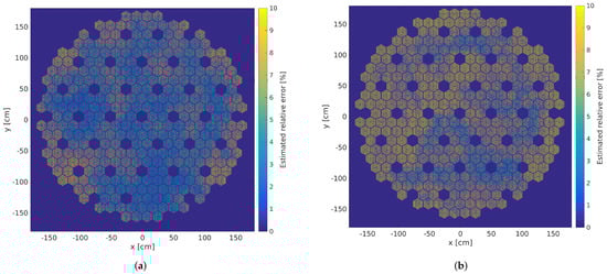 Pin-wise relative error distribution for middle nodes (a) and topmost nodes at the end of the transient, t = 13.8 s (b).
