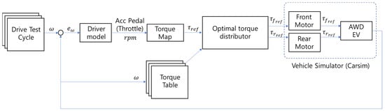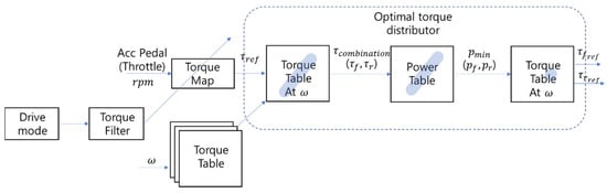 Figure 6 shows a detailed structural diagram of the TMS system. The throttle of the TMS system is activated by the driver or the autonomous driving controller; the reference torque can then be calculated through a torque map. The input target torque is reconfigured into a drivable torque map for the front and rear wheel motors according to the speed required to set the torque line. The torque line composed of the current input torque value may be used to configure the power line using the motor efficiency map at the corresponding speed. The configured power line indicates the power that is consumed according to the torque distribution ratio of the current front and rear wheel motors. The smallest value indicates the time when the front and rear wheel motors are combined most efficiently; as such, the optimum efficiency point can be found by setting the minimum point. The front and rear wheel target torques derived through the optimum efficiency point are used as control inputs for the vehicle through the inverter.