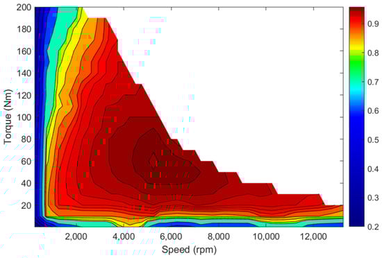 The vehicle’s reduction ratio calculates and applies the characteristics of the target motor through matching with the main driving area data. As the target motor, the 60 kW driving motor of the 2010 Toyota Prius, which shows significant differences in efficiency at specific speeds and torque intervals, was selected. Figure 3 below shows the efficiency contour graph of 60 kW PMSM motor in 650Vdc environment applied to TMS. The data was adapted from 2010 Toyota Prius analysis data. [19,20]. Unlike the transmission of an internal combustion engine vehicle, an electric vehicle uses a final reduction gear.