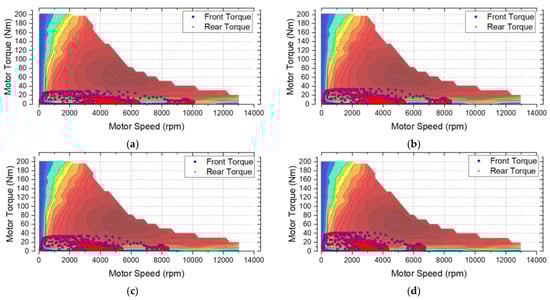 Figure 4. DER of 60 kW motor according to the following gear ratios: (a) 12:1; (b) 10:1; (c) 8:1; (d) 5:1.