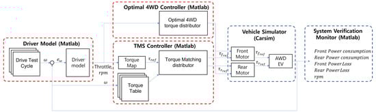 In order to configure the driving environment of the target vehicle, the driving simulation environment was configured by linking MATLAB Simulink and Carsim. Figure 5 is a simulation environment configured to verify the conventional 4 WD and TMS control performance. Based on the driving test cycle, the upper torque command is calculated through the driver model. A driver model PID controller that adjusts the upper torque command value according to the speed and vehicle condition was designed. The upper torque command value is controlled by transmitting the final torque distribution value to the motor of each axis through the 4 WD and TMS controller, or by dividing it by the brake pressure reference according to the condition. It is configured to use the motor reference torque of the rear axle of the front and rear wheels that is output from Carsim as input torque. The output of each variable from Carsim was classified in the form of a graph or matrix in Matlab and used for verification.