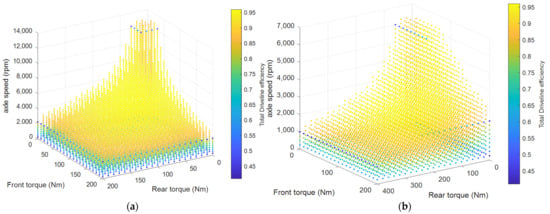 The TMS system uses matrixed efficiency data to solve the nonlinearity of Equation (2). Since the efficiency of the motor is determined nonlinearly according to the driving rotation speed and torque, it is difficult to formulate it in a single equation. However, the matrixed efficiency data is used as a lookup table in the TMS system and can easily be matched. It is possible to match the torque matrix required by the two motors with the output matrix generated for each torque, and to express the density in the map according to the efficiency.