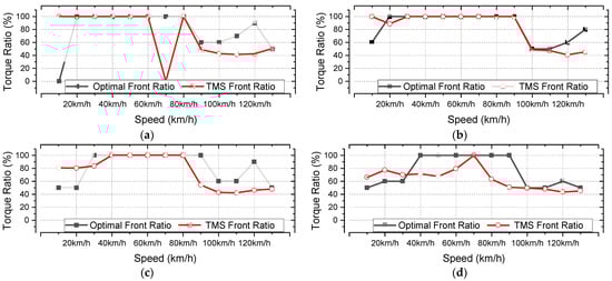 Figure 8. Torque Distribution ratio of optimal 4WD and TMS: (a) Gear ratio 10:1, (b) Gear ratio 8:1, (c) Gear ratio 7:1, (d) Gear ratio 6:1.