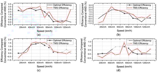 Figure 9. Efficiency gains versus conventional 4 WD: (a) Gear ratio 10:1, (b) Gear ratio 8:1, (c) Gear ratio 7:1, (d) Gear ratio 6:1.