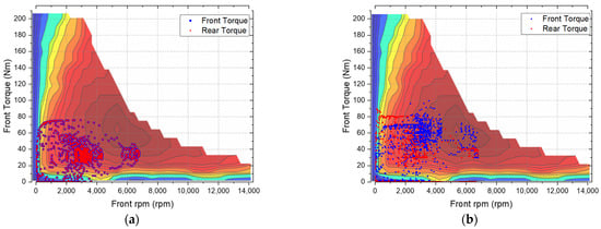 In Section 3, the driving points of the 4 WD and TMS controllers were compared through an EDR constructed for vehicle design. Figure 10 is a DER graph derived through UDDS under a load of 240 kg and a 10% gradient. The position of the torque point cluster near 3000 rpm showing the most operating points revealed improved efficiency in the TMS controller graph.