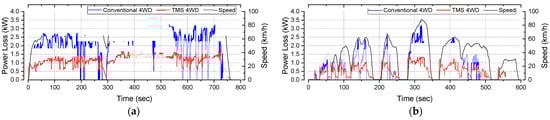 In all three cases and five cycles, the TMS method showed loss reduction compared to 4 WD. In particular, it showed a high loss reduction rate, i.e., more than 19%, in all of the cycles except for the NYCC cycle.