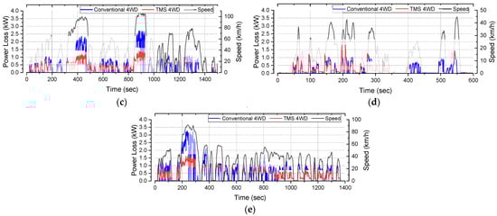 The five driving cycles shown in Figure 11 are HWFET, SC03, LA92, NYCC and UDDS. They were set to run within a speed error range of 0.5 km/h. Regenerative braking was not considered, and mechanical braking was substituted in situations where braking was required. The speed change over time of each cycle can be confirmed in the speed item. The Highway Fuel Economy Driving Schedule (HWFET) represents a 765 s highway driving condition of less than 100 kph (60 mph). SC03 has a cycle of 600 s as an air conditioner “Supplemental FTP” operation schedule. The LA92 has a cycle of 1735 s as a third-class medium-sized vehicle. LA-92 is for Class 3 Heavy-Duty vehicles. The New York City Cycle (NYCC) is a 598-s test characterized by low-speed stop and stop traffic conditions. The EPA Urban Dynamometer Driving Schedule (UDDS) is commonly referred to as the “LA4” or “city test”; it is a 600-s test representing urban driving conditions. It is used for light vehicle testing. Figure 11 compares the power loss of the motor according to the driving cycle in a vehicle using a reduction ratio of 10:1 for the front and rear wheels. It shows that the loss of TMS 4 WD is less than that of a conventional 4 WD.