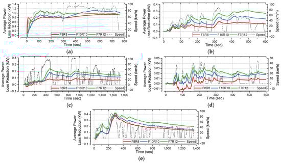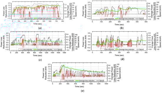 Figure 12. Loss-reduction and average-loss-reduction of drive motor power in five driving cycles using a reduction ratio of 10:1 for the front and rear wheels: (a) HWFET, (b) SC03, (c) LA92, (d) NYCC, (e) UDDS.