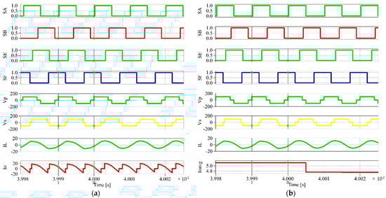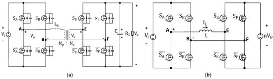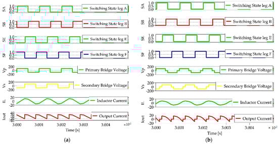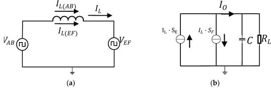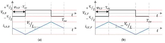 The primary side bridge consists of legs and , with switches and , , while the secondary side bridge includes switches and . All switching commands have a 50% duty cycle (complementary high and low sides), each leg has a phase value (), measured with respect to an arbitrary zero time-instant and normalized with respect to the switching period (i.e., a phase value of one corresponds to a delay of 1−). The primary-side bridge voltage is generated with values or zero, while the secondary-side voltage is ± or zero. The voltage across the leakage inductance (series inductance) L is the difference between and the reflected at the primary (i.e., (i.e., ), resulting in a current flow. The inductor current is usually controlled by changing the phase-shift between the primary and secondary commands (simplest modulation technique: single phase-shift [1,8,30]). The output current can be evaluated considering the state of the legs E and F, i.e., the inductor current (reflected to the secondary) is short-circuited (when ), directly routed to the output (when only is on) or inverted (when only is on).