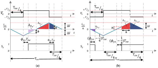 The magnitude and direction of the power flow or charge transfer at each switching cycle is determined by the respective phase-shifts between each leg and the reference one, i.e., leg A. Unlike previous work, in this case all possible modulation techniques can be considered, since the analysis is not constrained by any restriction between the four legs. Each bridge can connect the inductor and a DC voltage source (input or output), so that the square wave voltage sources of the primary and secondary bridges in Figure 3a have the same amplitude as the input voltage (for and ) or output voltage ( and .