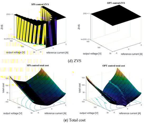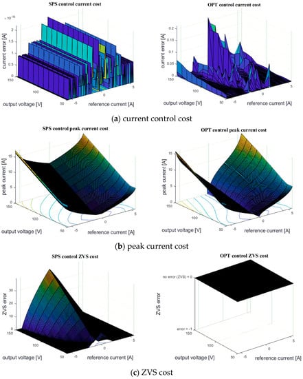 In the following, a cost function has been formulated (20), which considers the current “control” accuracy, the current stress of the switches, conduction losses and occurrence of soft-switching. The function adopted is the sum of the squared average output current error , absolute maximum inductor current and zero voltage switching error . The latter variable evaluates the soft-switching capability in the specific operating point is analyzed in terms of logical 1 for ZVS achieved in all legs and 0 otherwise along with which represents the amount of current missing before reaching the ZVS threshold. The constants , and are the weighting coefficients for the three parts of the cost, respectively: