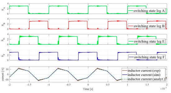 The output current transferred to the load is calculated based on total inductor current and the switching state signals of legs , , as shown in Figure 3b. The output current (i.e., flowing to the load and parallel output capacitor ) is then: