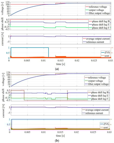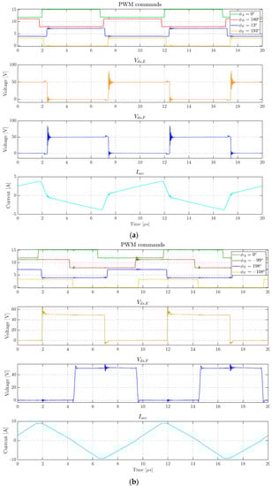 Comparison between SPS control and optimized modulation; both the controls reach the same operating point: (a) SPS control, the secondary switches do not reach the ZVS condition; (b) arbitrary (optimized) control, all the legs reach the ZVS condition.
