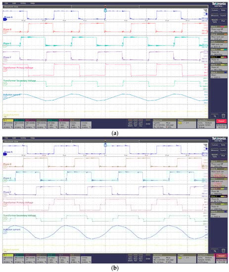 Steady-state tests for SPS closed-loop control have been carried out with fixed input voltage () and different values of output voltage, which correspond to different values of phase-shift (). Varying the switching frequency between 60–140 kHz to analyze and optimize the ZVS threshold range, to figure out its effect on average output current and to exploit the switching frequency as a further degree of freedom to extend the ZVS range. These tests are performed as an application of the proposed SPS control method (presented in Section 3.1) and for the sake of experimental validation of the obtained analytical results with SPS closed-loop control.