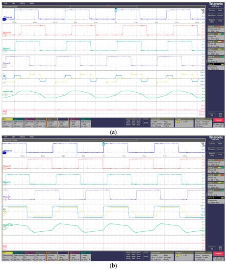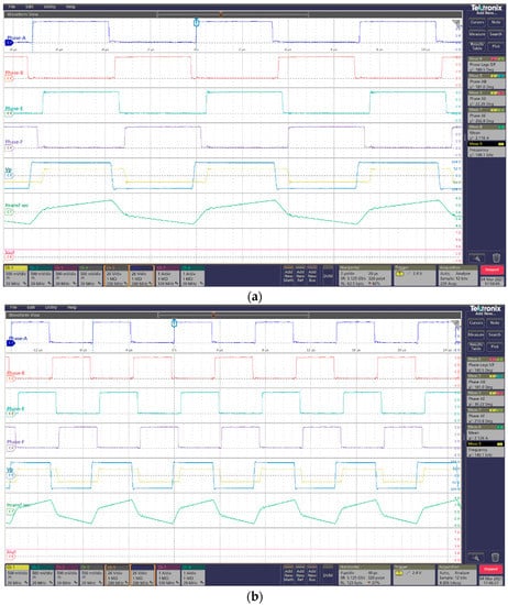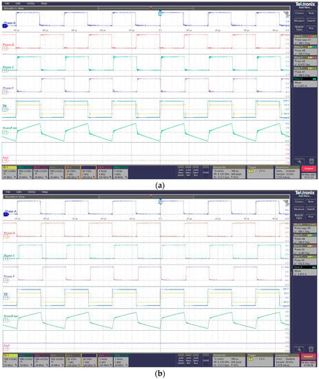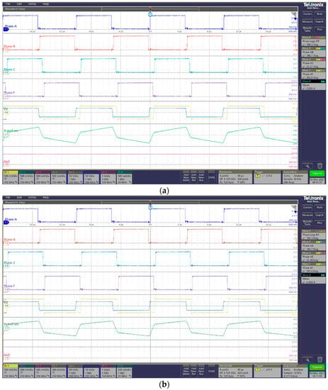 In order to validate the optimized strategy, a comparison with the SPS has been carried out. The same operating condition has been set with both strategies, which is a reference output voltage of 50 V and 2.2 A as load current. In the SPS case shown in Figure 20a, the secondary legs (E and F) do not reach the ZVS condition. This is confirmed by looking at the 2nd (orange) and 3rd (blue) traces (high-side drain-to-source voltage of leg E and F, respectively) where a big ringing occurs during the turn-on of the active devices, indicating that they are in a hard-switching condition. Moreover, due to the voltage drop of diodes, the voltage during dead-times is either below zero or above output voltage. On the other hand, in Figure 20b, where the optimized modulation is shown, it can be seen how both legs E and F are in soft-switching state since the huge voltage ringing has disappeared, and it is clearly possible to observe the diode voltage drop (small overshoot on drain-to-source voltage as soon as the turn on ends).