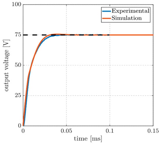 Finally, the dynamical behavior of the proposed SPS closed-loop control scheme (Figure 6) has been tested, applying a step variation of the output voltage set point from 0 to 75 V. As shown in Figure 18, the experimental recording is almost overlapping the corresponding simulation trace. The rise time is consistent with the design of voltage regulator, which exploits the inner part of the schematic (open-loop current control) as a controlled current source, which linearizes the behavior of the controller, as seen by the outer voltage regulation loop.
