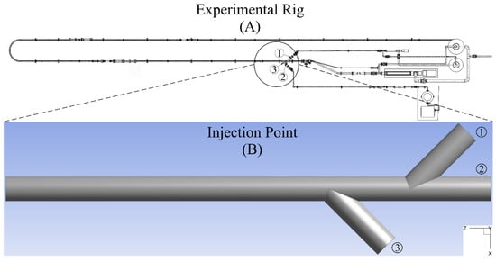 Top view of the complete experimental rig setup (A), injection point close-up (B). (1), (2) and (3) phases nozzles.