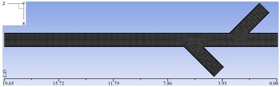 A hybrid of advancing-front meshing [18] and the Cut-cell method [19] was used to construct the numerical domain mesh. The advancing-front method has advantages over common grids, such as facilitating tessellation in geometrically complex domains and allowing the mesh density to be adjusted. The complexity of the geometry, specifically at the Injection Point, lies in the staggered nozzles, an area to which the Cut-cell mesh must be adapted, as illustrated in Figure 2. The combination of these two methods is used to obtain a constant growth of thin layers and cells from the pipe walls to the domain’s edge, allowing a good representation of the physical phenomenon, particularly when high-order discretization schemes are used.