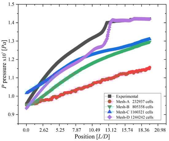 It is observed that Mesh-A greatly underestimates the pressure values, indicating that the representation of flow, that is, hydrodynamics, was correctly modelled, but the precision of the values is precarious compared to Meshes -B, -C and -D. On the other hand, Mesh-B still underestimates the pressure values in comparison with the experimental data. Although the number of cells is just over three times the number of cells in Mesh-A, 44% less than Mesh-C and 54% less than that of Mesh-D, the results are still far from those of experimental. In the case of Mesh-C, it shows an area with values already close to the experimental ones with a deviation of 22%, which is still unacceptable due to the required precision of the results.