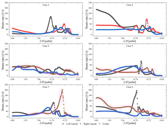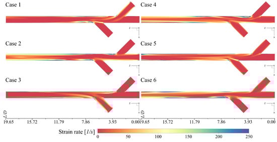 In every case, the strain rate reveals the bulk fluid trajectory, but cases with major differences are noted. At a first glance, two scenarios can be differentiated, 1 and 3. After , the deformation that comes from the geometry corners starts to diminish, giving the appearance of a smooth phases blend. Nevertheless, in Case 3, higher values >250 [1/s] can be distinguished. These can be products of the swirl, eddies, or turbulence within the fluid interacting with the pipe walls as studied Soleimani et al. and Meher [27,28].