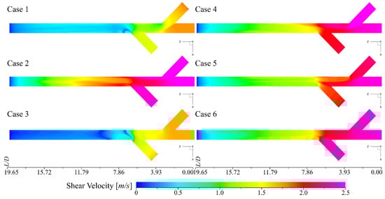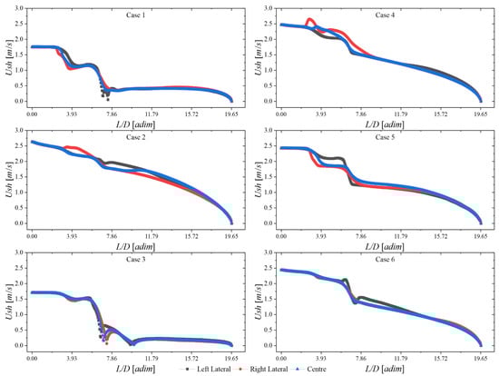 In Figure 5, the values of the markers are shown in the scatter plot. In the same way as in the analysis of the contours of , in the scatter plots, it is possible to recognize differences between the case studies. In the first place, Cases 2 and 5, the shear velocity does not exceed , indicating that, at least in the location of these three markers, the mixture is smooth which is characterized by the amount of fluid coming from the lateral injectors and directs towards the centre of the main pipe concentrating the bulk fluid. Secondly, Cases 1 and 4, whose development is influenced by the left-loaded fluid. As there is more of the same fluid on that side of the pipe, it is noted that the fluid behaviour will be substantially affected until there is sufficient development and distribution along the pipe. This is demonstrated because just after is when the disturbances occur. Finally, although in Cases 3 and 6 the disturbances also begin at , they are of greater magnitude . This is essentially due to the fact that, regardless of the fluid that enters through injector 3, it receives the direct impact from the other inlets.