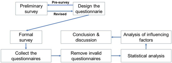 This current study explores the household energy consumption patterns and carbon emissions, taking Guangzhou, China, as a study area. To achieve this goal, we collected energy data through field research on household energy consumption in 2020. Figure 2 shows the flow of our data collection and processing stages. Before starting our formal research, we conducted a pre-survey to adapt the questionnaire to the actual situation of local household consumption, such as household equipment, the size of the community, etc. After completing our formal research, we screened out some questionnaires that were not detailed, incomplete or had logical errors, and then conducted a statistical analysis of the valid questionnaires and carried out this study.