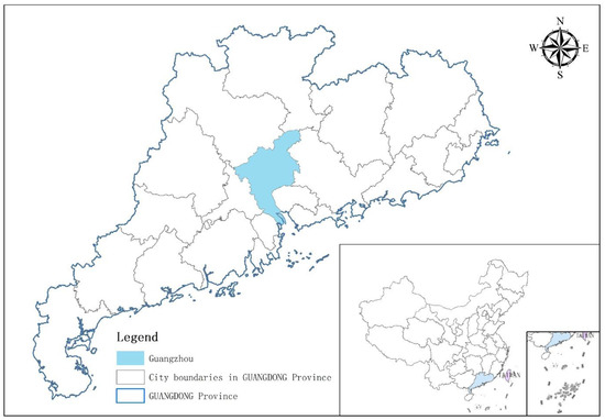 Guangzhou is located at 112°57′–114°3′ east longitude and 22°26′–23°56′ north latitude. Located in the subtropics and straddling the Tropic of Cancer, it has a hot summer and warm winter, with an average temperature of 15.2 °C to 28.9 °C throughout the year; Guangzhou is also one of the major cities with a small average temperature difference in China. July and August are the hottest months of the year, reaching 37 °C, followed by June and September at 35 °C. The average relative humidity is 78.4%, and the average annual precipitation is 194.67 mm. The total population of Guangzhou in 2019 was 9.54 million, with a population density of 2111 persons/km2, ranking it among the cities with the highest population densities in China. The urbanization rate of the resident population was 86.46%, which was higher than the national level of 60.60% [27]. Energy consumption by urban residents in 2019 was equivalent to 7,499,200 tons of standard coal, accounting for 72.39% of the city’s total energy consumption by urban and rural residents [28]. Urban households were the main consumers of energy. Figure 3 shows the location of Guangzhou and Guangdong Province in China.