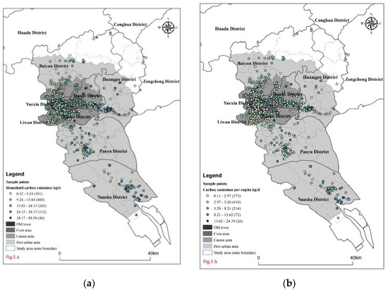 Spatial distribution of household carbon emissions in Guangzhou. (a) Household carbon emissions per day. (b) Carbon emissions per capita per day.