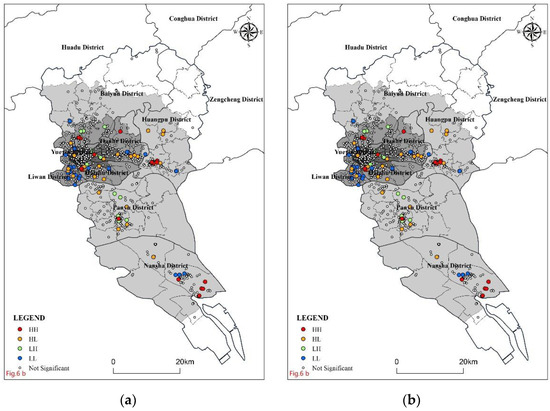 LISA cluster maps of carbon emissions from household equipment in Guangzhou. (a) Carbon emissions from water heaters per capita. (b) Carbon emissions from kitchen equipment per capita.