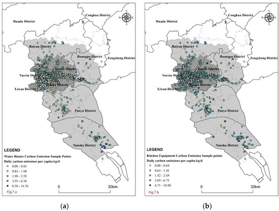 The carbon emission data were calculated based on the previous formula and energy consumption data. We found that the average household carbon emission in Guangzhou was 15.31 kg/day, and the per capita carbon emission was 4.49 kg/day. Due to the different attributes of various aspects of households, there was a significant difference in the carbon emissions among Guangzhou households. The ratio of above-average carbon emissions to below-average carbon emissions was close to 3:5. Figure 5a,b was created by linking the carbon emission results obtained from the energy consumption data with the existing points to compare the spatial distribution characteristics of carbon emissions from average household domestic energy use and per capita domestic energy use. The results show that there were distinctive features in the locations of the samples with high values of average household carbon emissions; most of the high-value samples were clustered in and scattered around the central city, especially in Yuexiu, Haizhu and Baiyun districts. The number of samples with low carbon emissions was high, and these samples covered various social subdivisions and administrative areas, mainly around the central city boundary, with a significant number of samples with low values within the peri-urban area. The sample distribution of per capita carbon emissions was similar to that of average household carbon emissions, but due to the large sizes of some of the households in the sample, the number of high-value samples of per capita carbon emissions was lower than the number of high-value samples of average household carbon emissions. However, most of the high-value samples were still clustered in and around the central city, and the number of low-value samples increased.
