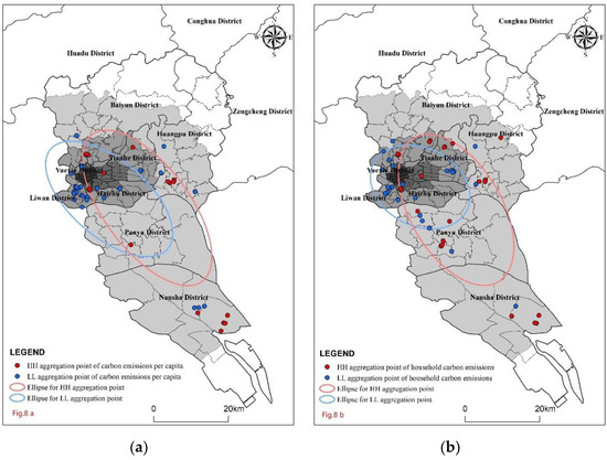 The SDEs of carbon emissions in Guangzhou. (a) The standard deviation ellipses (SDEs) per capita. (b) The SDEs of carbon emissions household carbon emissions.